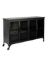 An industrial cabinet with a sleek Black finish with 4 glass doors. This low storage cabinet has a multitude of uses from bedrooms to living rooms or dining rooms ! Store away items you want partially hidden. This sturdy black unit features 1 fixed shelf and 4 doors with 2 lockable casters.